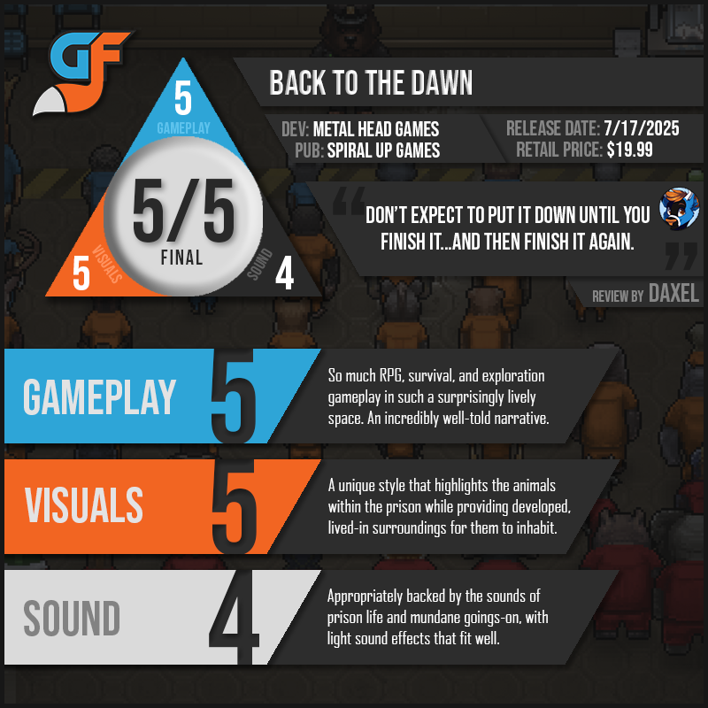 Back to the Dawn is truly surprising. Its scale is much more deep than its surface appearance gives off, and you can tell how much the development team invested into the creative storytelling process. It shows in every decision you make, every animation of every animal character, and every story beat you hit. Living within and trying to make your escape from out of the prison feels important and impactful, and you really find yourself caring about (some) of the people locked inside there with you, and the people trying to help you get out (literally and figuratively) of the conflicts you find yourself wrapped up in. If you start Back to the Dawn, don’t expect to put it down until you finish it…and then finish it again.