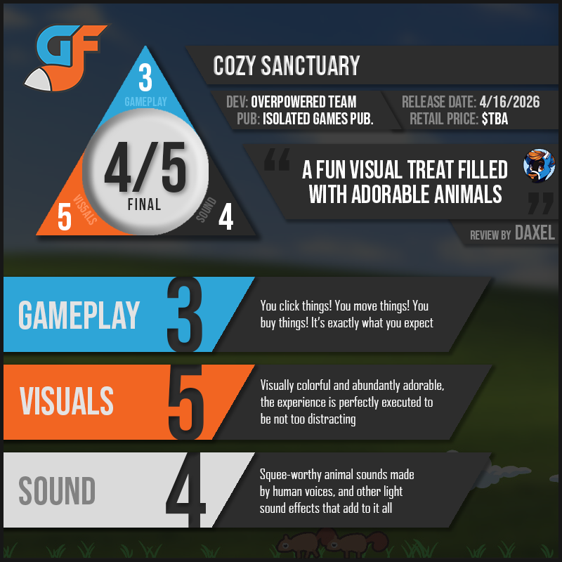 Cozy Sanctuary isn’t loaded with a ridiculous amount of unlocks or things to do, but the adorable list of animals available to unlock and help keep you company is commendable for an idle game. Everything stayed well within acceptable computer requirements for this type of casual experience, and I had no issues at all with how it operated on my computer around other applications. If you’re into these types of fun visual treats that play as peaceful gaming applications, you’ll surely enjoy Cozy Sanctuary.