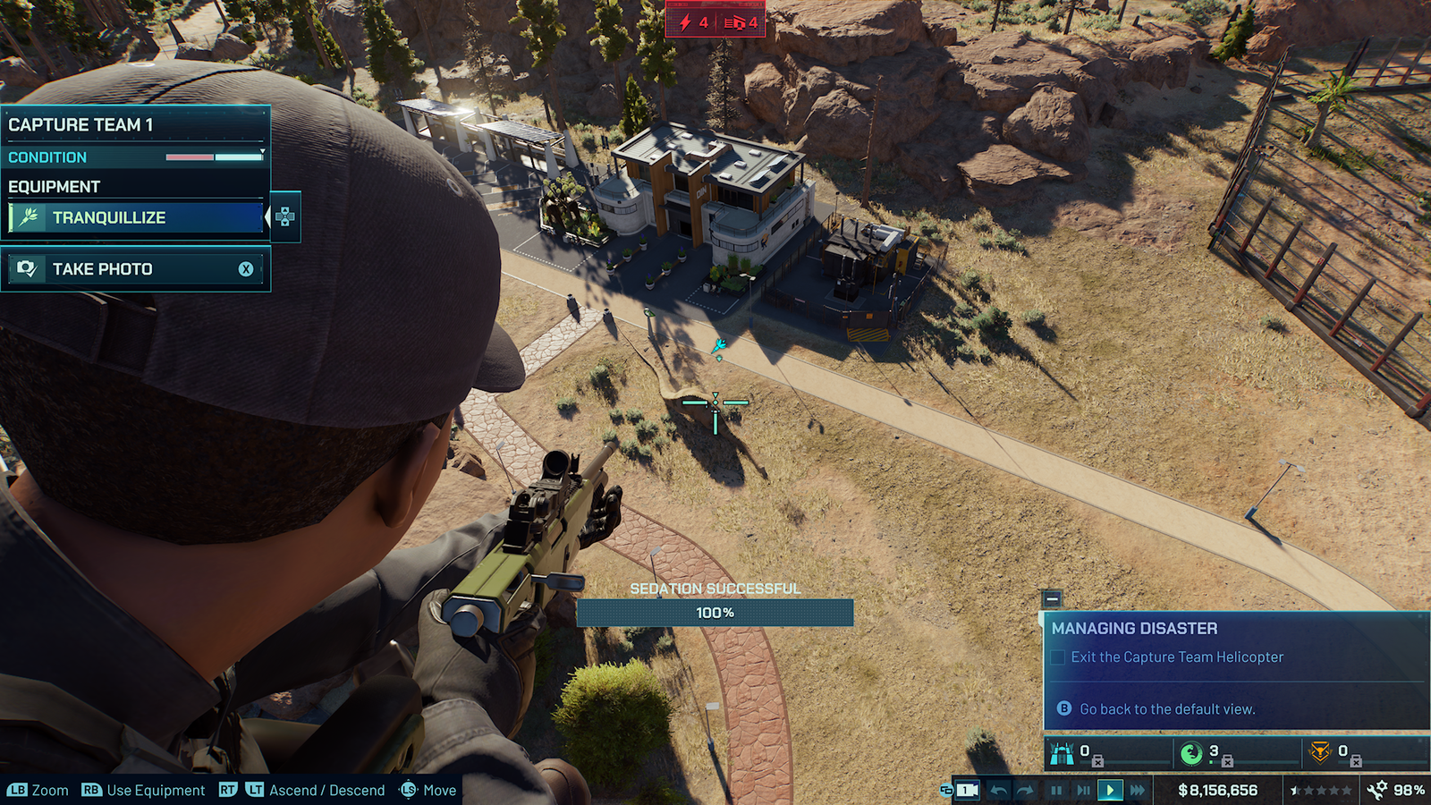Another sour note of the game I want to mention are the Dino Attacks. Once in a while, dinosaurs may either roam in and request take out in the form of your guests and workers or, if you aren’t paying attention, the electrified fences may fail and a dinosaur or two may escape. While, yes, you can let your sadistic side out and let the people get nommed; remember, you are trying to run a legitimate theme park and letting your guests live out their voracious fantasies is not good for your bottom line. So, in order to combat these attacks and prevent your park from being the inspiration for YouTubers who discuss theme park accidents, you first need to build an Emergency Bunker for everyone to evacuate to and a Response Facility to handle the dinosaurs. Once the dinos are free or have wandered into your park, you can send these guys out and they’ll tranq the dinos, putting them into a peaceful sleep, allowing you to send a crew out and add the dinos to your park. These guys are also able to tranquilize sick dinos for the medical staff to examine them and, in a cool bit of gameplay, you can actually take control of the Response team, as well as other team members, and do the dirty work yourself. I do have to say that the controls here weren’t the best and felt just slightly loose but not enough to feel bad. That being said, despite being a cool addition and a decent tension adder, this never really felt like a major problem. As long as you’re keeping an eye on the generators, making sure the dinos are well-fed, and you have security cameras set up, dino attacks become just a minor hindrance then anything substantial. That’s not to say it’s a bad addition, I just would’ve loved to have seen it fleshed out just a bit more. Like, imagine a mode where you play the Response Team and your job is to hunt down and tranq all the escaped dinos in a first person horror game or, heck, imagine being able to play AS the dinos and wreak havoc yourself! I did make an interesting observation and this is honestly a bit funny. While I was playing the game and was controlling the Response Team, I took a close look at their Tranq Rifles and noticed it had an underbelly M203 Grenade Launcher attached. I don’t know why that got my attention but I’m just having this image of one of the members shouting ‘Say “Hello” to my little friend!’ and firing a grenade from the tranq as a last resort. That aside, though you have to admit that would be funny, the only other real sour note I want to mention is the campaign itself. To be honest, it’s just OK at best and mediocre at worst. To put it bluntly, It’s really just a glorified longform tutorial to get you used to the mechanics of the game, with some minor story bits here and there, and nothing really substantial. Not that I was expecting a game where you manage a theme park to have storytelling to rival Mass Effect, mind you, but it would’ve been nice to have just a decent story. Though, come to think of it? That actually would be kind of a cool game idea. I will also admit the dinosaur-activist faction in the game, who will try to sabotage your parks, is a cool idea as I can totally see something like them existing in real life if dinos were somehow resurrected. Still, while I’ve no doubt fans of the Jurassic World series would enjoy the campaign but, for others, it’s good for the first few levels then you’re probably better off playing the sandbox mode for the rest of the game.
