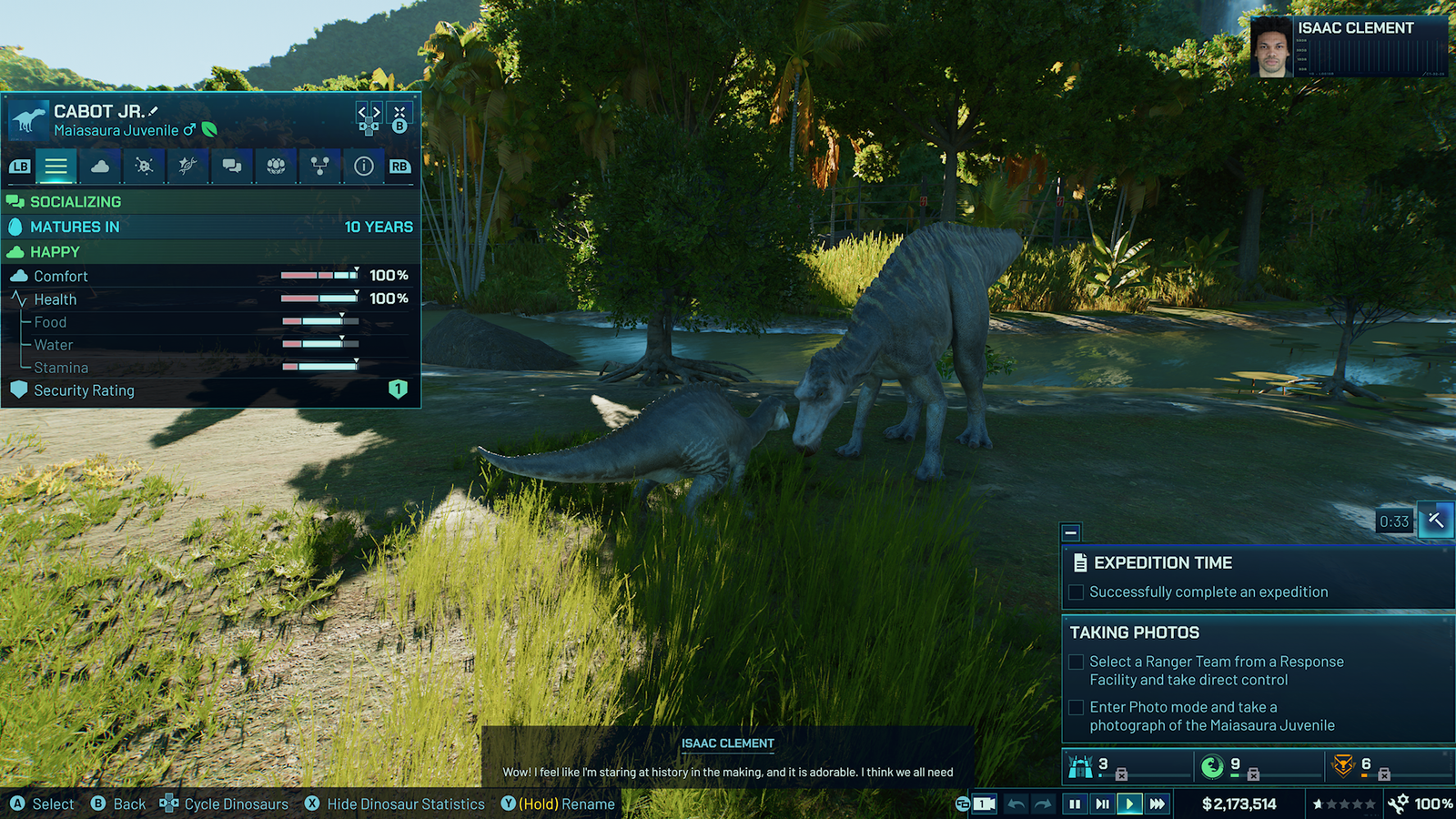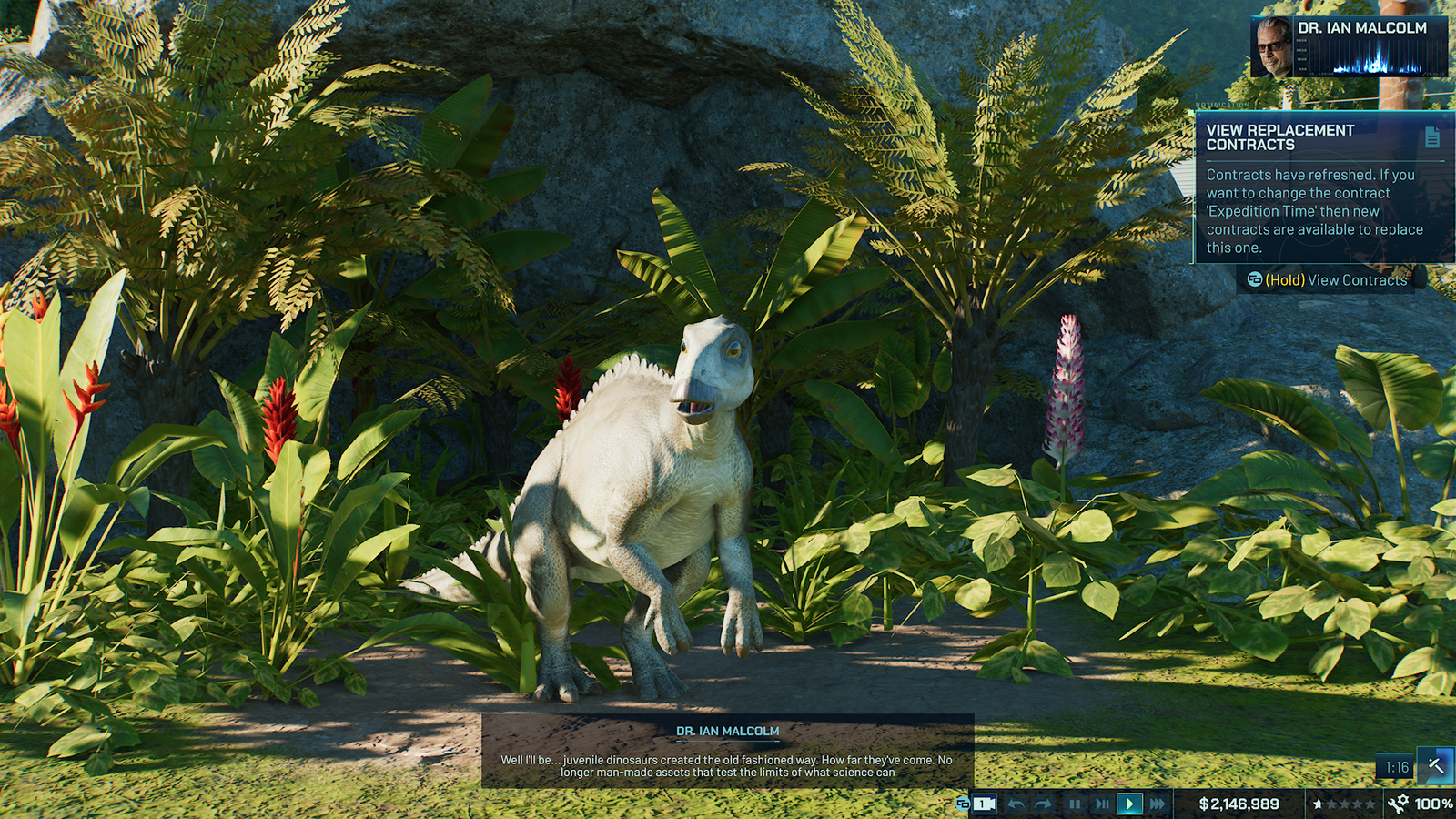But before I talk about the issues with the game, let me start with the positives as I do have a lot to mention. For starters and most important, the console version of this game, of which this review is based on, works and plays very well. Unlike other park sims I’ve played on Xbox, I was quickly able to get used to the controls and not have to fiddle with any options right out of the gate. I also never encountered any sudden acceleration when moving and placing items was very easy to do, so I must commend Frontier Developments for nailing this aspect. On an unfortunate note, I do need to address one minor issue that occurred which soured my first impressions: After a day one patch came out, I couldn’t actually play the game as it kept crashing on me when it started and, when I finally got into the game properly, I was only able to progress just past the intro map in the campaign before it crashed again. Thankfully, that issue was patched out the following day and I haven’t experienced any crashes since then, so kudos to them for fixing that problem quickly. Back to the positives, I also really enjoyed how the game’s campaign slowly eased you into park management and also introduced new gameplay mechanics in a logical and meaningful way so as to not overwhelm the player with tons of tutorials and pop-up boxes. The lack of huge pop-up menus is good as I feel they would’ve taken away from seeing the sheer beauty of this game. Yeah, this is one of the better looking park sims I’ve played in a while. Everything, even the human NPCs, are modeled and rendered amazingly well, with just the slightest bit of realism, and I like how you can not only get up close to each dinosaur, but also view them like a visitor via the tours or viewing ports on the enclosures. Where I will say the game does kinda begin to falter a bit is in the sound department. Now, while the dino’s sound great and I do like the little incidental sounds here and there, especially the park noises you can hear, it’s the actual voice cast that is hit or miss for me. Some of the voice actors are decent and do a good job at what they’re given but others, especially Jeff Goldblum, really come off as iffy at best. I know that’s a thing with Jeff and I do think he’s a good actor, I feel he could’ve just held back his style of acting just a bit here. Actually, if I could go off for a wee bit on a small tangent regarding the dinosaurs themselves: What is up with some of the dinosaur names? Like Gallimimus and Velociraptor are fine, but then you got names like Yutyrannus, Attenborosaurus, and Archaeornithomimus. I get scientists are the ones naming them but you’d think they’d at least come up with a more creative name than those names, right? At least the raptors don’t have feathers on them (Sorry, I’m a full Scaley-Dino lover).