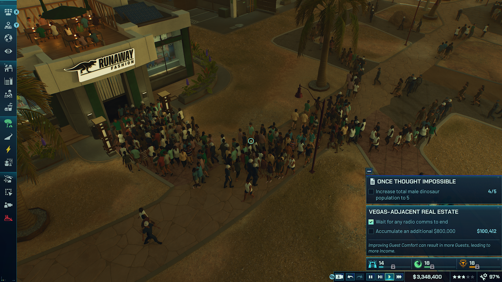It’s when we get to the actual playing of the game itself where I begin to feel mixed on the title. To start, for being a park builder, there really isn’t much in the way of customization you can do. Outside of choosing what a store sells, what realistic color a dinosaur can be, and various decorations, there really isn’t much here, though I like how you can choose what style the buildings you place can have (be it classic Jurassic Park or modern Jurassic World). You can’t even adjust individual prices on anything, so no charging visitors $15 just to use the bathroom. Another thing I didn’t really much enjoy was just how picky both the guests and dinosaurs can be and I do mean picky. With guests, if you don’t have stores selling just the right item or offering the right food or, in the eyes of the guests, good stuff to do inside the stores, then they’ll be unhappy and spend less or not even go there. Sometimes, it makes sense what they want but, other times, I was raising an eyebrow at what they preferred giving the environment for the scenario. Like, why would you want something hot in a hot environment? I did notice that the pathfinding for the human NPCs, while good at times, tends to be on the stupid side. For example, I had a map where I had a decent path laid out near an enclosure and set it up with a store on one side, a medical facility in the middle, and a hotel on the other side with a restaurant selling burgers. I thought “Hey, this is a decent build!” but, apparently not! Half way through, I get a pop-up saying guests are complaining about lack of space to move around, which I thought was odd as there was plenty of space. That is, until I saw what was going on: All the guests were crowded around the first store and ignoring the rest of the area. Even when I added an extra pathway, they still crowded around that store, like it was selling the latest Pokemon cards and everyone was trying to get a pack before the scalpers grabbed them. I even checked the area fully and didn’t find anything blocking their path, which can happen if you forget to move one small rock as some items can camouflage with the pathways. While I do like how there’s an option to show what paths can cause conflicts, I have to question it as some paths that I feel are well made are considered problematic while others are OK.