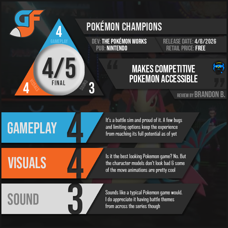 Is Pokémon Champions a work of art? Nope. Although I haven’t run into any personally, I’ve heard stories about the bugs in it. For what it is, I think its a fun and decent competitive experience. It’s not for everyone but what Pokémon game is? For all its faults, it’s worth checking out at least. It’s free to play on Nintendo Switch now with the mobile release slated for June of this year.