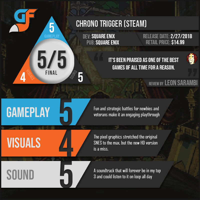Chrono Trigger is a JRPG made by Square Enix (Known as Squaresoft on original release) back in 1995. It had the Dream Team of RPG developers at the time: Hironobu Sakaguchi As Designer, Yoshinori Kitase as Director/Writer, Akira Toriyama as the Character Artist, Yasunori Mituda and Nobuo Uematsu as Composers, and Tetsuya Takahashi as graphics director. For an old-school JRPG fan, this is a fantastic lineup.