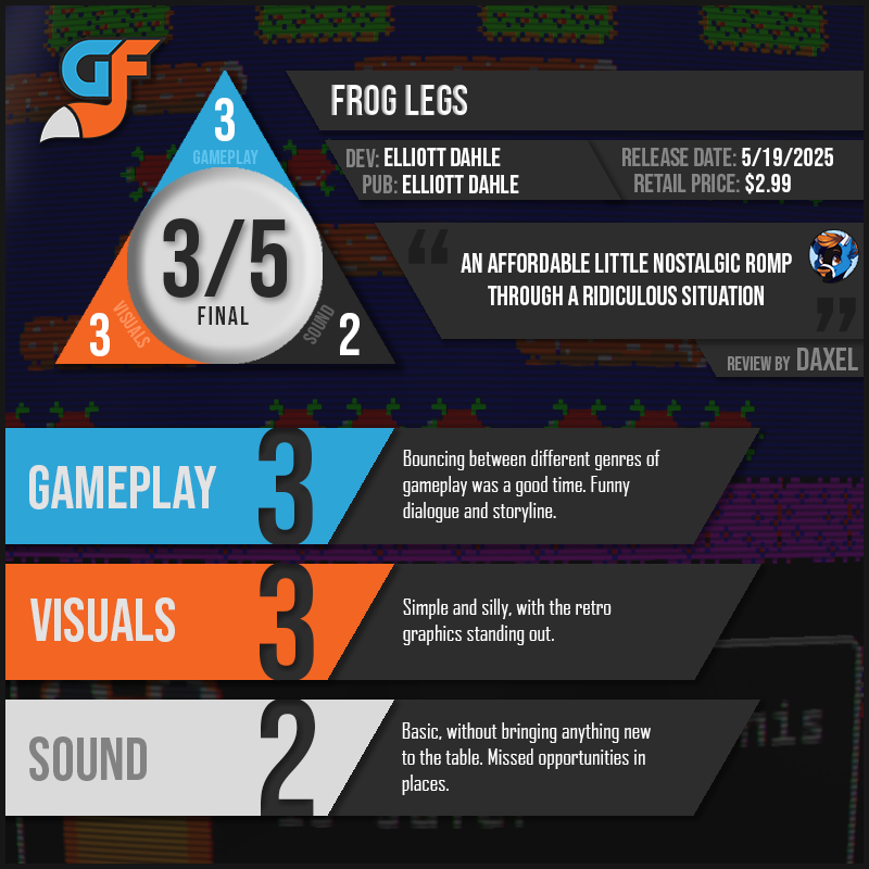 Frog Legs is an affordable little nostalgic romp through a ridiculous situation with colorful frog buddies. Grab some friends, grab some popcorn, and then invite them to play through the game as everyone enjoys a little escape. It doesn’t provide replayability for the single player experience, but does for the sheer surprise factor for those that don’t know what they’re in for. Is it perfect? No. But for an indie dev with a creative idea, it’s well executed.