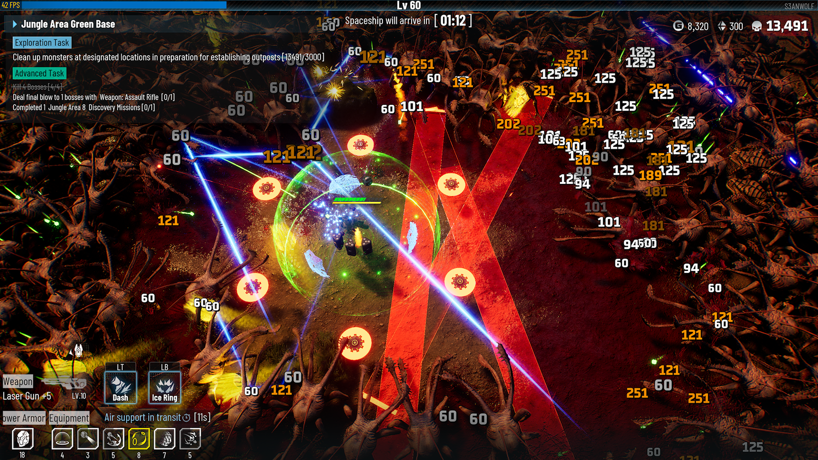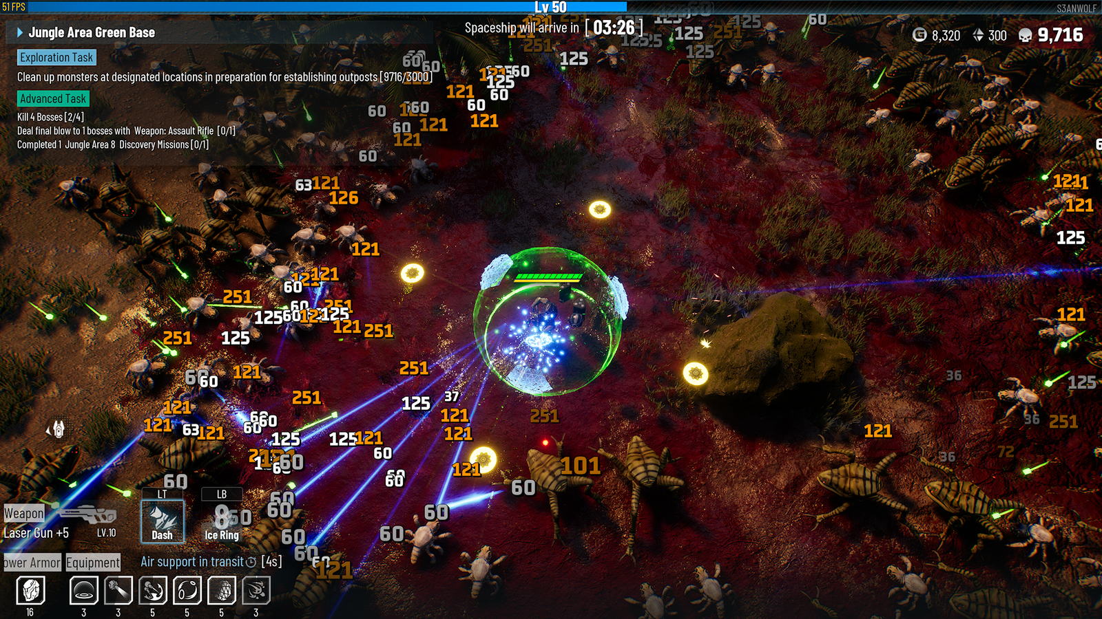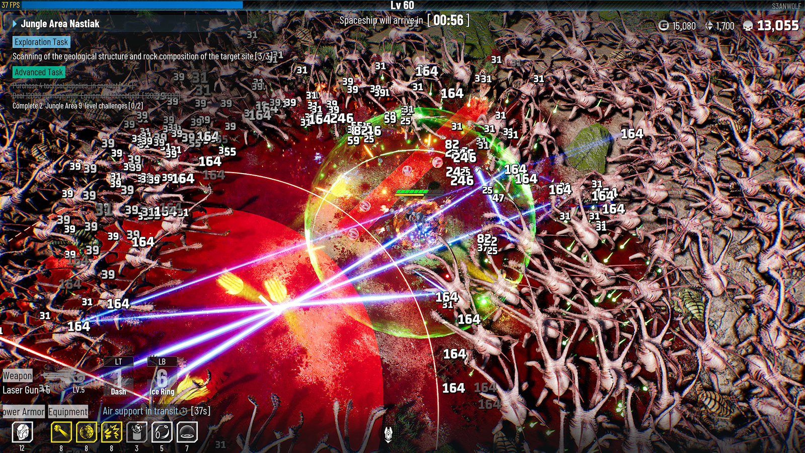 That brings me to the enemies and, Holy Enemies, Batman! There are ALOT to eradicate! I read there max can be 20,000 on screen and, if that’s the case, then the developer achieved this ten-fold! I know it’s not such a huge big deal, any more, seeing tons of enemies on screen, but believe me. When you see just how many enemies can fill your screen at once, you’d be impressed. Yes, it’s not to the levels of Vampire Survivors, but it’s still a lot and downright beautiful to see, in a morbid way, especially once the ground is caked in the enemies’ blood. The fact that, even with the massive hordes on screen, the frame rate rarely, if ever dipped, is equally as impressive and I applaud the developer for achieving this feat. But, this does lead to a bigger issue and that is the inconsistent difficulty. At times, I found it was very easy to die during a run from being overrun or just getting unlucky with the RNG, leading to many a level restart, while at other times the game became too easy because of just how overpowered I had become. Most of the deaths I had were thanks to trying to complete an objective, like destroying eggs or scanning an area (which alone took me multiple tries to pull off successfully), though, on that note, I will give the game praise for introducing missions into this genre to spice up the gameplay. Same time, I also love how each level can actually be completed, sorta like Vampire Hunters. When you begin a stage, you’ll see a countdown timer at the top and, when that hits zero, a ship comes in and picks you up, while also clearing away all the enemies for you, which is very nice and something I have to applaud this game for doing. I’m OK with horde shooters and trying to survive for as long as I possibly can, but sometimes I do like to be able to complete a stage and not overstay my welcome.
