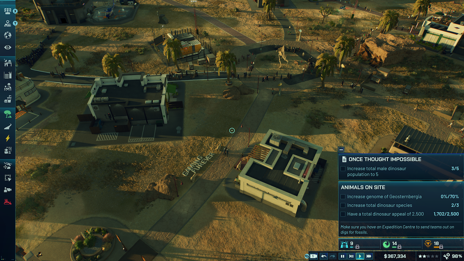 Despite those sour points and not really liking some of the gameplay choices, there are still some things in this game I really enjoyed. I like how you don’t just have the dinosaurs outright and, instead, literally reconstruct them via researching their DNA from fossils. Yes, while there are some dinosaurs out in the wild you can obtain from events that happen in game, most of them are acquired from reconstruction of DNA. However, you don’t do the reconstructing yourself nor do you do the excavating for the DNA samples, despite that honestly being a cool idea. No, here, that’s relegated to the scientists you hire and each one offers a few stat bonuses as well as a small bonus trait to better aid your park and efforts. And, yes, because you’re reconstructing dinos from DNA, that means you can create the infamous Hybrid dinos from the Jurassic World films, including the Indominus Rex, though you don’t get to make the Human-Dino hybrids from the scrapped Jurassic Park IV, which would’ve been awesome. I know not everyone is into the whole hybrid idea from the films, but it is still a neat idea and, again, something I can honestly see happening in real life. Just a small heads up when you’re at the egg stage; be sure you choose the right sex before hatching them or, you’ll end up like me, and accidentally end up with two female dinos and have to spend cash and research a new egg so you can have a male. Who knows, maybe the male dino liked having two females, I don’t know how dinosaur relationships work. Something else I really enjoyed and this is something I do wish more park sims would offer is that you can actually visit the park like a guest and view the dinos from either the various enclosures you build or participate in the vehicle tours either with the jeeps or those round spheres from Jurassic World…which, I’m going to sound a bit sadistic here, but I wish this game had a minigame where the dinos participate in a soccer (or Football if you’re European) match and can kick one of those spheres around with the humans inside or participate in a cooking show as a Julia Child-style Dinosaur where you crack the spheres open like eggs. Can you tell this game is making me long for a proper dino game where you play as a dino going after humans? I don’t mean that as a bad thing but more like “Hey, this game is giving me longings for other dino-type games!” type feeling.