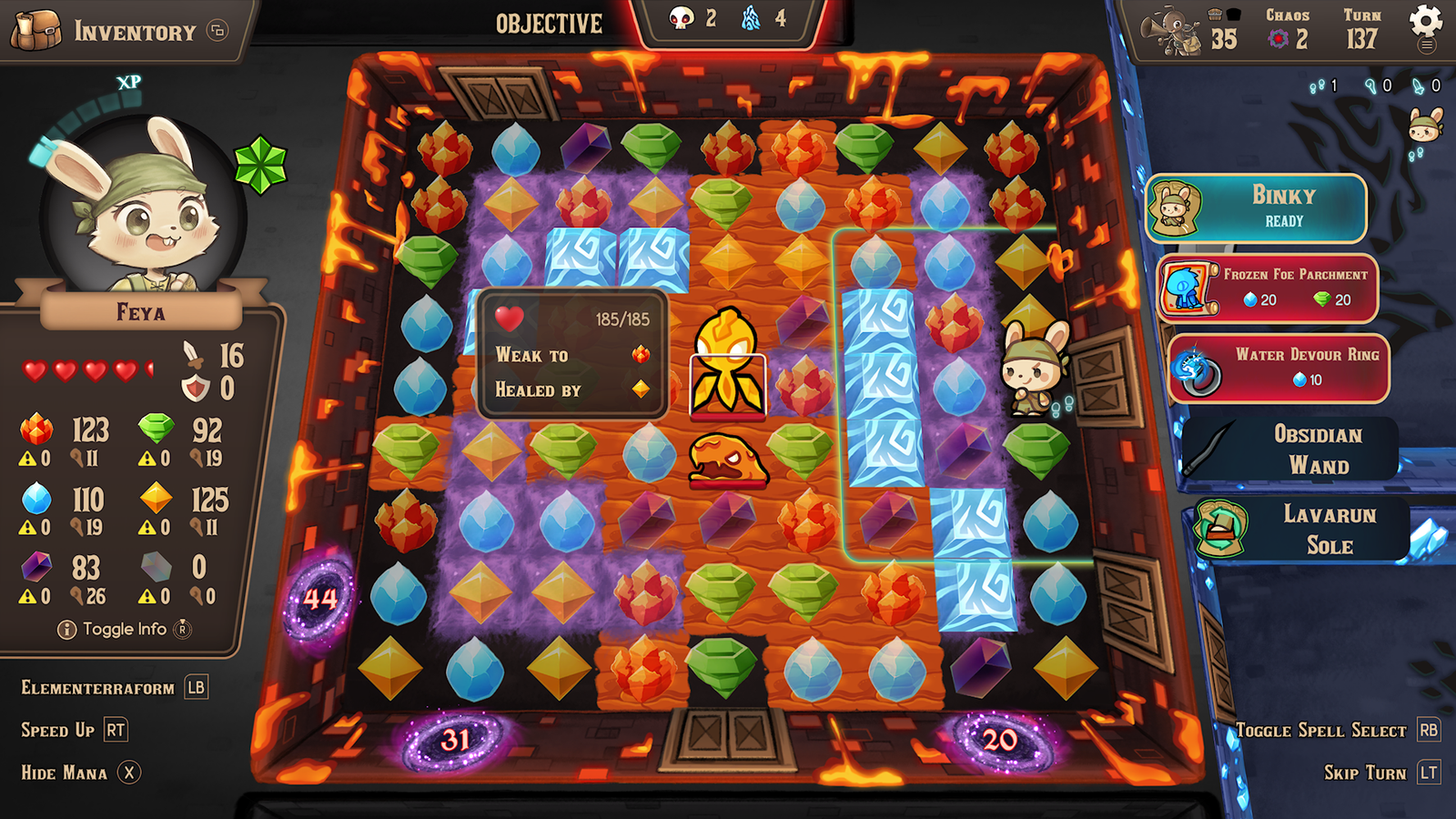 As mentioned earlier, there are three heroes to play as at the start, with three more to unlock for a total of six unique characters. You begin the game as the rabbit Feya, who has the ability to hop over multiple spaces which is a rather handy move, especially with enemies whose attacks can cover a wide area. After you clear the castle the first time, you get access to the Nekomancer Sonya, who has a ‘Shoot’ skillset that really comes in a pinch when dealing with enemies. I like how all of the characters have unique movesets tailored for them and I did enjoy playing with all of them as I traversed the castle and I enjoyed how you can mix and match their powers with other characters, in the chance you find an ability you prefer over the other. The NPCs you interact with, on the other side, I’m mixed on. The ants who run the store you visit in-between new floors and can draw you a map of the floor you’re on are nice and very helpful and I did enjoy their cheerful dialogue. It’s Jirou who I have the most problems with. He’s not a bad character as I do slightly understand why he is the way he is in the game. But, he comes off as too dull and too serious, not helped by the fact his character icon shows him with a blank expression all the time. It’s weird I compare it to another game, but his face reminded me of that one character from Omori. I actually began to dread seeing him whenever I failed a run as he would come on screen and just push your character outside and just walk away. I know it’s an odd thing to complain about, but it was the one thing that stood out the most about this character and it bugged me. Something else I want to mention and, your mileage may vary here, but I do like the simplistic voice acting. Instead of fully voice-acted dialogue, you get little Banjo-Kazooie-esque sounds to represent talking, which is something I really enjoy. I don’t mind quality voice acting in games but, sometimes, I want to hear some goofy dialogue instead of Patrick Stewart speaking of the closing days of the Third Era and this game delivers that in spades; Sonya’s little mews, for instance, are especially adorable and a bit giggle-inducing as, for whatever reason, my mind immediately wondered what the Meow Mix theme would sound like with her singing it. Funny enough, that brings me to the soundtrack itself and it’s another high point, with some nice music that has this Lord Of The Rings meets Banjo-Kazooie vibe going for it, along with a few tracks that reminded me of the underground levels of Yoshi’s Story (Fun game, by the way, you should check it out).