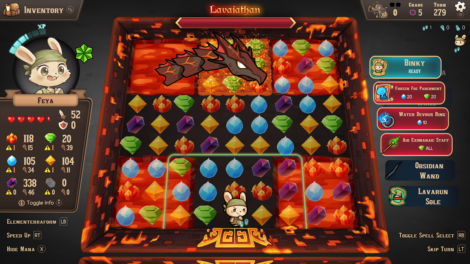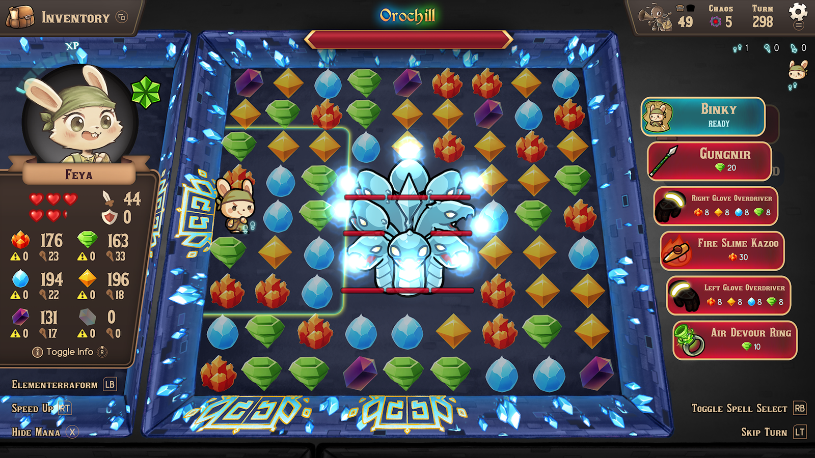 Really, I don’t have much in the way of actual complaints with the game, other than maybe the controls being just a bit off. You move your character with the directional pad and play the match-3 with the left thumbstick, moving the gems with either a button press or the right thumbstick. I did get used to the controls after a while but it did take a bit as muscle memory kicked in, resulting in wanting to move with the sticks and not the pad. I’m also not a huge fan of how, say, if your match-3 cursor is on one side of the screen and you decide to move your character, the cursor goes back to where you were and that tripped me up more times than not, resulting in some needless bits of frustration. Not enough to where I was getting angry, but just enough to give a sharp exhale whenever it happened. Also, the ‘speed up’ function, while a neat idea, I wouldn’t recommend using. It makes movement of your character slippery to where it was hard to even get to the door and I noticed some framerate drops when using it during the match-3 segments and when transitioning between rooms. Lastly, I said death isn’t a factor in this game, and I do mean that as this game really does feel too easy at times, with the only minor difficulty spikes coming in during some boss stages. A few bosses were easy to handle, and actually kinda cute to look at, but some took me multiple tries to slay thanks to their attack patterns. The Hydra, for instance, has an ice beam that can freeze spaces and gems, meaning damaging it is downright hard at times and you’ll quickly tire of hearing it charge up its beam attack. But, even then, the difficulty spike is only minor, hence why I feel this game is just a bit too easy. Even when the floor I was on had stage hazards like ice, fog, and sand, I never went “Oh, Crap, this is bad”, but more ‘Oh, OK.’ I’m not asking for it to be to the levels of, say, Dark Souls (although that actually would be hilarious to see a Dark Souls Match-3 Game) and it is nice to play a roguelike that isn’t super punishing (outside of losing all your gear whenever you die), I’m just mentioning this as I know some roguelike fans will be disappointed that it’s not a hard game.