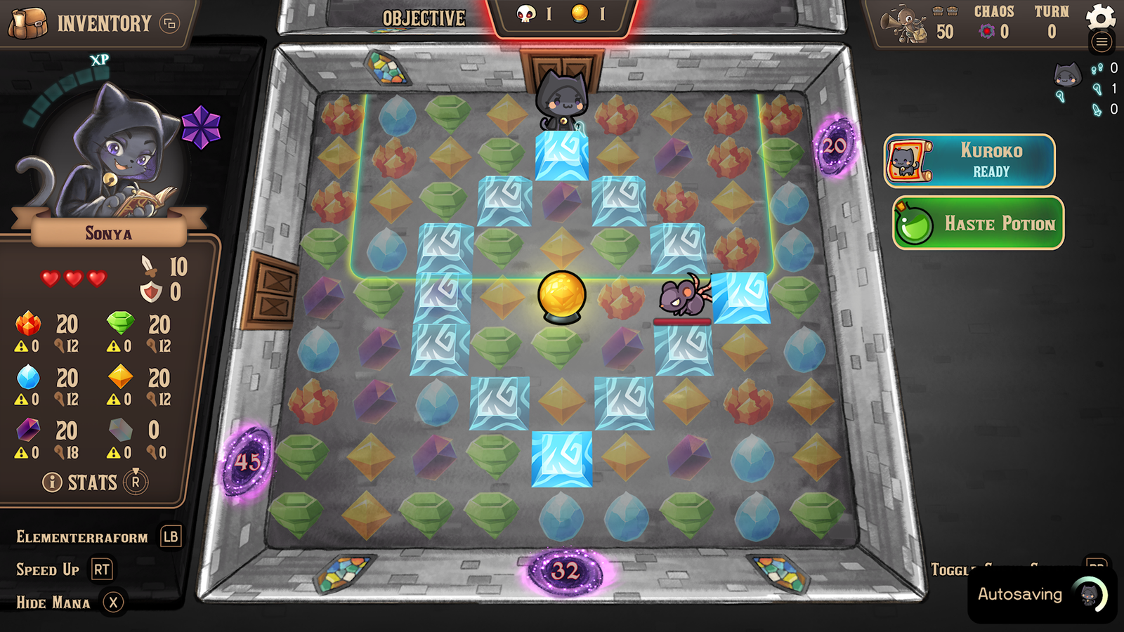 While this may look like a basic match-3 style game that you see on every mobile device, don’t be fooled. This is a fusion of Match-3 and a Dungeon Crawler with roguelike elements. As one of six intrepid heroes, you face various floors of a trapped castle as you hunt down the fabled book called the Nekonomicon. Thankfully, you won’t need to chop your hand off and attach a power tool to your arm to fight off the evil within. Instead, you use the powers of matching gems together, along with any item you come across during your journey, be it swords or wands. If you are even remotely familiar with the concept of a match 3, then you’ll know what to do here. If you aren’t, then the idea is as simple yet complex as something like Tetris but not as complex as Wetrix. In every room, you’ll see a bunch of gems, or mana as they’re called here, on the screen and you move either up, down, left, or right and try to match it with gems of the same type. While the main idea is to match three, higher matches get you special abilities to clear more gems. For example, if you match five gems in a row, you get a special star that, if you combine it with any gem in the surrounding area, clears out all the gems of that type. Likewise, if you combine two stars together, it’ll clear out the entire board and, possibly, damage and/or slay all the enemies as well. Yes, there is combat in the game and it’s equally as basic as you either damage enemies by making matches or bumping into them, the former is probably the best way to dispel enemies and the latter is only recommended if you are in a pinch. Every enemy has a gem or so they are weak to, but also gems they can heal from, so there’s a surprising bit of strategy here, something I have to commend the developers for including. They could’ve just made it so that all gems do the same damage to every enemy, so going the extra mile and including a Weak/Heal stat is a nice touch. Of course, you can also attack using the various weapons you find in the castle, like the aforementioned swords and wands, but I personally found that matching gems did the most damage to them and ended up using the hand-held weapons only as a last resort or if I just wanted to get through a room faster. I appreciate how you can’t really spam these special abilities infinitely and you need a supply of gems/mana to even use them, which is easy to restock as you get gems every time you match them. I’m not a fan of the items that drain your gems when not in use, to where it’ll damage you if you have no gems, but those items are clearly labeled and can easily be avoided.
